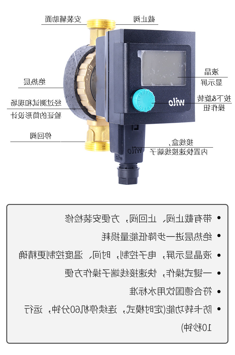 法国原装进口,集成LED显示屏,适用于热水器、锅炉回水循环,提供即开即用的舒适水,可三时段定时,循环管路配高温消毒。